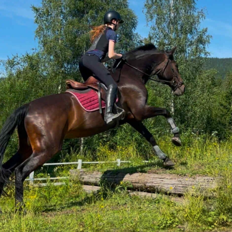 Karina er utdannet rideinstruktør III fra Norsk Hestesenter og NRYF trener I. Hun har mange års erfaring fra undervisning og har selv konkurrert t.o.m. MB dressur og 1,30 m sprang.